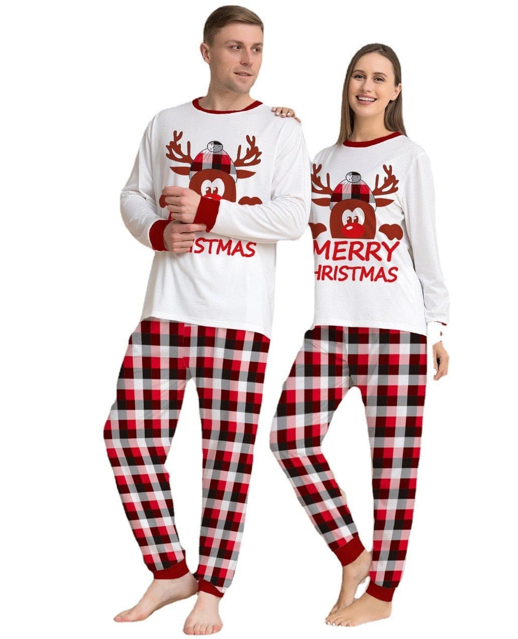 Prenez une photo souvenir devant votre sapin avec une tenue assortie en famille. Pour le haut de pyjama, vous avez le choix entre un t-shirt à manches longues avec un motif de cerf rouge. Pour le bas de pyjama, un pantalon à grands carreaux est au rendez-vous.