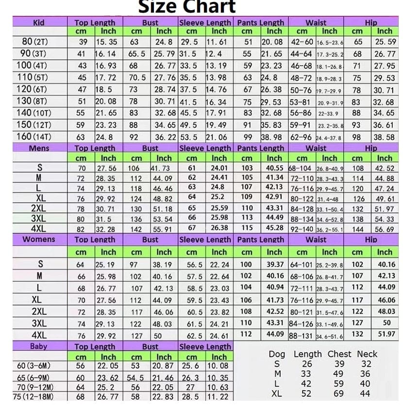 Aussi nous vous conseillons de choisir un pyjama de Noël famille adapté à sa morphologie. A vous de voir si vous voulez bien porter votre pyjama de Noël près du corps ou si vous souhaitez plus de liberté, mais avec des coupes agréables avec élastique. Cette tenue de Noël Christmas, à manches courtes ou manches longues, est disponible dans toutes les tailles, pour femme/maman, père/papa, enfant, bébé et même chien pour des souvenirs inoubliables de Noël, de joie, riche en couleurs.